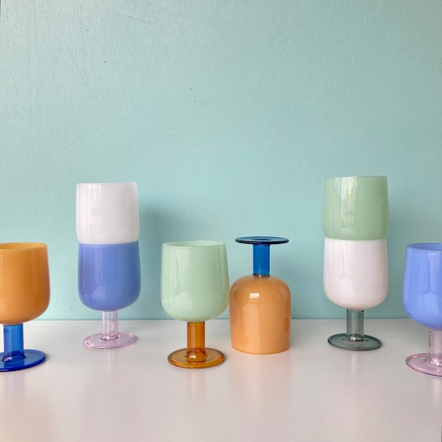_TWO TONE WINE GLASS_ レトロな乳白色のミルクガラスと 透け感のあるカラーガラス 2つの耐熱ガラスを組み合わせた 脚付きグラスです 安定感のある円柱の短いステムが カジュアルでポップな印象 持ちやすくスタッキングも可能◎ テーブルワインにはもちろん 炭酸水やジュースにも いつものドリンクが特別な気分で味わえそうです ////////////////////// ~ ミルクガラスの色特徴 ~ 〔 MILK WHITE 〕乳白色 〔 MILK BLUE 〕ブルーベリーのような紫みのブルー+乳白色 〔 MILK YELLOW 〕ミカンのような橙色に近い赤みのイエロー+乳白色 〔 MILK GREEN 〕マスカットのような淡いグリーン+乳白色 SIZE_約φ6.5cm/H11.5cm MATERIAL_Heat Resistant Glass 容量_200ml 耐熱温度差_120℃ 食洗機・電子レンジ使用可 ////////////////////// ※手作業により一点一点つくられた製品です。 製造の工程上、若干のサイズ個体差、細かなキズ・気泡・色ムラ・歪みなど生じる場合がございます。 全てメーカー及び自店共に良品と判断されたものをお届けしております。 ご理解いただいた上ご購入をお願いいたします。 ////////////////////// 【 再入荷のお知らせについて 】 商品ページ内「♡お気に入り」登録をお願いいたします。再入荷後にお知らせが届きます。 誠に恐れ入りますが、メールでの再入荷連絡・入荷予定のご連絡は個別に差し上げておりません。 予めご了承くださいませ。 //////////////////////