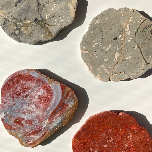 _ JASPER COASTER _ 天然石ジャスパーを 大胆に切り出したコースター クォーツの細かな結晶から生み出された 抽象画のような色合いと模様 一つとして同じものはない 大自然が生み出した 多彩な表情がたのしめます アクセサリートレイにしたり 様々なディスプレイにお使いいただけます SIZE_約W13.5cm/H1cm前後 〔裏面に滑り止め付き〕 ////////////////////// 天然素材を使用している為 色・柄・形状・大きさ全てに個体差のある1点物です。 素材の特性として、表面の凹みやキズに見えるようなものがある場合がございます。 断面よりわずかに粉状の欠けが発生する場合がございます。 個体差をお選びいただく事はできません。 予めご了承くださいませ。 ////////////////////// 【 再入荷のお知らせについて 】 商品ページ内「♡お気に入り」登録をお願いいたします。再入荷後にお知らせが届きます。 誠に恐れ入りますが、メールでの再入荷連絡・入荷予定のご連絡は個別に差し上げておりません。 予めご了承くださいませ。